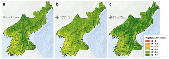 Interestingly, there was a low abundance of forest resources in the 1980s even prior to the forest degradation that occurred in the 1990s. Compared with a recent period, the level of vegetation greenness was not high. The average NDVI of the whole land cover of the late 1980s was 0.692 and late 2010s was 0.731. This presumably reflects the fact that national forest management or forest resource development strategies had not been implemented at the time. Additionally, considering the low food production and crop yields at the time, it is thought that the lack of vegetation health in croplands affected the vegetation greenness value [11,25]. Spatially, most of the mountainous areas exhibited high levels of vegetation greenness. However, the vegetation greenness was relatively low in high-mountainous areas such as the Gaema Plateau (Figure 2a).
