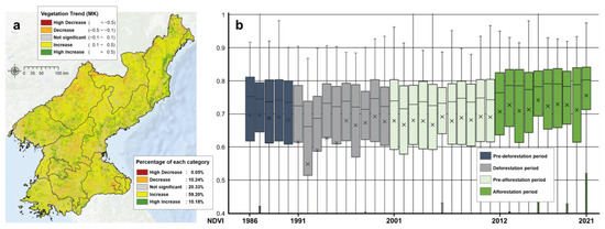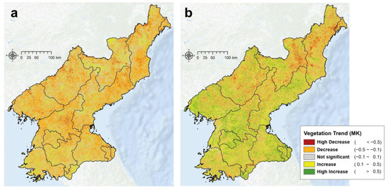 Figure 4. Spatiotemporal vegetation trend of North Korea: (a) deforestation period (1986–2000) and (b) afforestation period (2012–2021).
