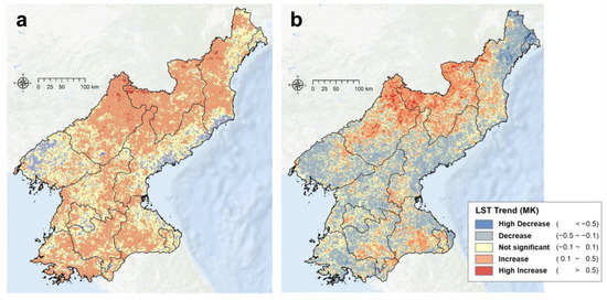Mann–Kendall trend analyses were conducted to numerically calculate time-series changes in vegetation greenness and the land surface temperature of North Korea. This method is a widely used nonparametric approach for assessing the presence of monotonic trends in time-series data [35,36]. The approach has been continually applied for the analysis of vegetation data [37], including a number of recent studies that analyzed changes in various environmental variables [36,38]. This approach has benefits for spatiotemporal environmental data analysis because it does not assume a specific data distribution and is not affected by outliers [39]. The Theil–Sen method was applied to calculate the slope of the Mann–Kendall trend [40]. The estimator of the Theil–Sen slope is the median of the slopes calculated for the observed values at all pairwise period steps for a total of n (n − 1)/2 slopes.
