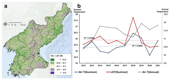 Figure 6. Spatial correlation with vegetation greenness and land surface temperature (a) and air temperature and surface temperature changes in the last 10 years (b).