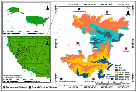 The study area encompassed the extent of two elevation tiles derived from 30 m spatial resolution DEM (digital elevation model), covering the central portion of the San Gabriel Mountains range with an area of approximately 518.05 km2 (117°45′0″ W–118°6′30″ W, 34°9′30″ N–34°26′0″ N) (Figure 1) and an altitude range of 215–2552 m. The terrain in this area is steep and it contains a large number of peaks and canyons that are very rugged and difficult to traverse. As post-fire meteorological data of the study area acquired from the National Oceanic and Atmospheric Administration (NOAA) only included temperature data, rainfall, and daytime data of three airports climate stations nearby were added. According to the climate data of seven weather stations near the study area, the climate of this region is the Mediterranean, with mostly dry summers and wet winters. The annual precipitation range is 1.3–72.7 mm and the annual temperature ranges from 10.4 °C to 26.74 °C. The rainfall is mostly concentrated in spring, with an average rainfall of 68.23 mm from January to March. Shrubs are widespread in low-altitude areas without continuous tall forest cover; coniferous and oak forests are densely distributed above high altitudes (1500 m). The study area maintains a highly primitive state, which is suitable for exploring the spatiotemporal relationship between vegetation regeneration, burn severity, and climate and terrain factors.