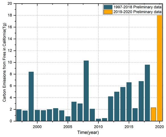 California wildfire carbon emissions from 1997 to 2020 (from NASA Earth).