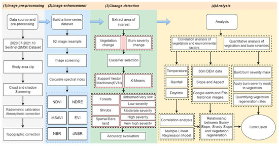 Flow chart of spatiotemporal monitoring and analysis of post-fire vegetation regeneration.