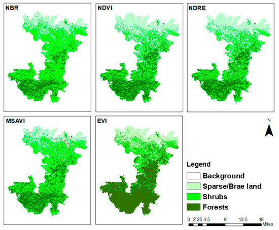 To optimize the spectral index suitable for the classification and time-series monitoring of the two vegetation communities, in this study, the K-Means clustering algorithm was used for the pre-classification test for NBR, NDVI, NDRE, MSAVI, and EVI pre-classification. The classification accuracy was set to 0.001% and the number of iterations to 300. According to Figure 4, the EVI can clearly classify vegetation and non-vegetation, but has difficulty discerning between forest vegetation and shrubs vegetation in densely mixed areas, where the detection effect is not good. The classification results of the NBR, NBVI, NDRE, and MSAVI are difficult to distinguish by visual interpretation.