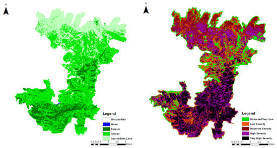 This paper draws on the 2019 California landcover map created by the Copernicus Global Land Service Center (http://land.copernicus.eu, accessed on 11 December 2021) from the interpretation of very high-resolution reference datasets from multiple sources that were regularly updated over successive years (RapidEye, SkySat, PlanetScope), and which enables an overall accuracy of land cover better than 80%. Google Earth Pro historical imagery and ESRI World Imagery Wayback historical imagery were used to verify the classification accuracy of vegetations and classified according to the dNBR threshold classification proposed by the European Forest Fire Information Service (EFFIS).