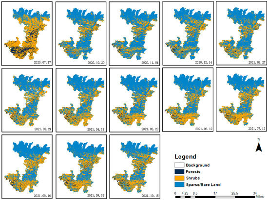 In addition, as this paper only focuses on monitoring the forest vegetation and shrub post-fire vegetation communities, there is no distinction between detailed forest species. The classification accuracy of subsequent months is verified by calculating the confusion matrix (Table 5).