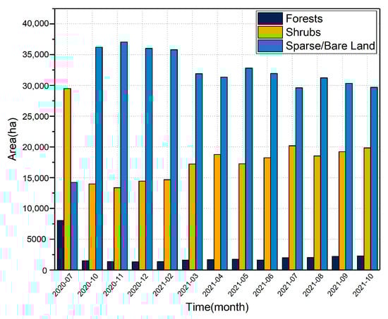 The vegetation community time-series change chart (Figure 6) shows that the forest vegetation coverage dropped sharply from pre-fire (July 2020) to post-fire (October 2020). It also reveals that the forest communities decreased from 8046.8 hectares to 1498.07 hectares, a decrease of 81.4% (approximately 6548.73 hectares), while the shrub communities decreased from 29,504.35 hectares to 14,003.73 hectares, a decrease of 52.5% (approximately 15,500.62 hectares). Furthermore, it indicates that the bare soil/sparse land area increased from 14,225.63 hectares to 36,202.32 hectares, an increase of 154.5% (approximately 21,976.69 hectares) and that the vegetation damage was very serious (Figure 7).