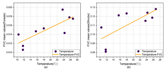 Temperature and vegetation regeneration relationship map: (a) forests-temperature and (b) shrubs-temperature.