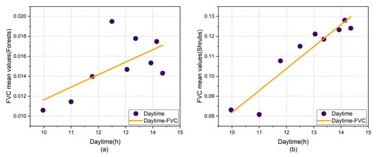Daytime and vegetation regeneration relationship map: (a) forests-daytime and (b) shrubs-daytime.