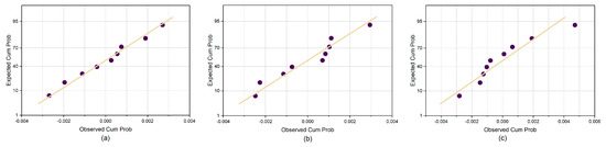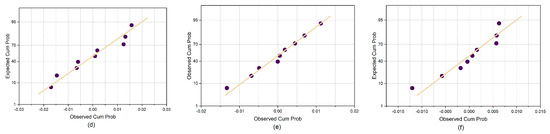 P−P plot of regression standardized residuals: (a) FVC (forests)-temperature; (b) FVC (forests)-rainfall; (c) FVC (forests)-daytime; (d) FVC (shrubs)-temperature; (e) FVC (shrubs)-rainfall; and (f) FVC (shrubs)-daytime.