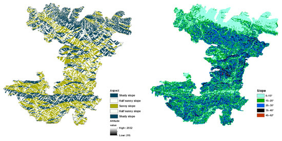 Meteorological data for post-fire 12 months on temperature, rainfall, and daytime duration were acquired from the National Oceanic and Atmospheric Administration (NOAA) and the Weather Spark website (https://weatherspark.com, accessed on 11 December 2021) (Table 2). The data contained the monitoring results of seven climate stations within the study area. The spatial distribution of the climate stations is shown in Figure 1. We also collected slope and aspect data of the study area derived from 30 m spatial resolution DEM (digital elevation model), which were acquired from the SRTM (Shuttle Radar Topography Mission) website (http://www2.jpl.nasa.gov/srtm/, accessed on 20 October 2021).