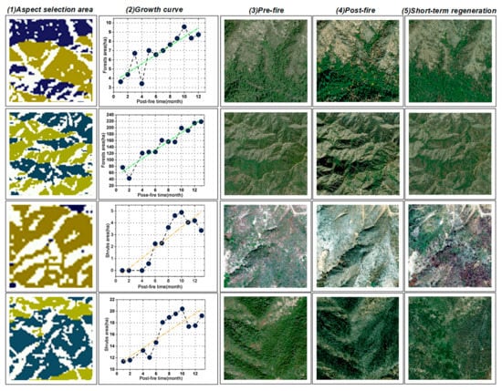 Environmental factors may change the trend of the original vegetation growth [69,70]. To quantify the impact of post-fire climate factors on the regeneration of forest and shrub communities, a linear regression model was used for independent and mixed analysis between temperature, rainfall, and daytime. Regression models were fitted to the dynamics of the regeneration process in agreement to other studies [71,72]. In addition, we used the slope analysis tool in ArcGIS 10.8 to divide the study area was divided into shaded slopes (315–45°), sunny slopes (135–225°), and five gradients (0–15°, 15–25°, 25–35°, 35–45°, 45–62°) of slope type. By combining the World Imagery Wayback high-resolution historical image data, the impact of the sunny slopes, shady slopes, and slopes on post-fire vegetation regeneration was verified.