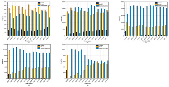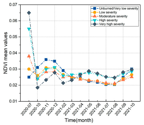 To further quantify the relationship between burn severity and vegetation regeneration (see Section 4.3), we used Envi v5.3 software to create masks for the burn severity of four gradients, respectively, and nested the mask samples within the time-series vegetation area, obtaining a vegetation area map at different burn severities. We then used statistical analysis to obtain the regeneration rates of forest and shrub communities under five burn severities.