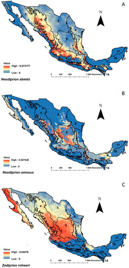 Ecological niche model of three species of sawflies (Hymenoptera: Diprionidae), projected according to the Mexican biogeographic provinces [53]. (A) Neodriprion abietis, (B) N. omosus and (C) Zadiprion rohweri; 1. Baja California, 2. California, 3. Sonoran, 4. Sierra Madre Occidental, 5. Altiplano Norte, 6. Tamaulipeca, 7. Gulf of Mexico, 8. Sierra Madre Oriental, 9. Altiplano Sur, 10. Pacific Coast, 11. Volcanic Axis, 12. Balsas Depression, 13. Sierra Madre del Sur, 14. Soconusco, 15. Los Altos de Chiapas, 16. Petén, 17. Yucatán, 18. Del Cabo, 19. Oaxaca.