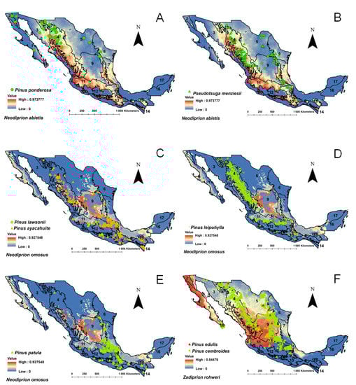 Distribution of hosts in Mexico for three species of sawflies (Hymenoptera: Diprionidae), projected according to the Mexican biogeographic provinces [53] and its ecological niche model. (A,B) Neodriprion abietis, (C–E) N. omosus, and (F) Zadiprion rohweri. For biogeographic provinces’ names, check Figure 1.