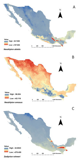 In contrast, for Z. rohweri, the most important bioclimatic variables are related to temperature (mean temperature of the wettest quarter and temperature seasonality), which together make up 88.1% of the calculated niche model (Table 3). As in the case of the studied species of Neodiprion, it seems to be true that each species of Zadiprion has a particular set of bioclimatic variables to define the ecological niche [i.e., annual mean temperature was the best predictor for Z. jeffreyi Smith [10]). It is necessary to carry out a greater number of studies to understand the influence of these variables on the biological cycle of sawflies. As with N. abietis, researchers should look for this species in the areas identified as suitable.