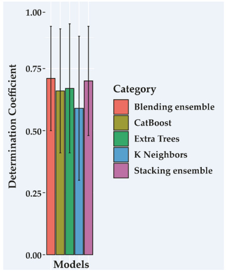 In addition, as an assessment of overall model performance, we verified the 80 combinations of test set data, with the response. Thus, it was evident that the blending ensemble, followed by the stacking ensemble, produced relatively higher average values of R2 (Figure 1) and a lower degree of dispersion.