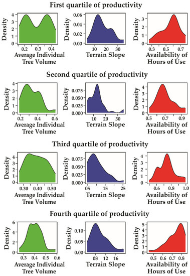 Although the algorithms used in the construction of models do not allow interpretability, as evidenced by productivity quartiles of the test set, the density distribution of predictor variables of individual mean volumes of trees, terrain slope, and machine availability was determined (Figure 3).