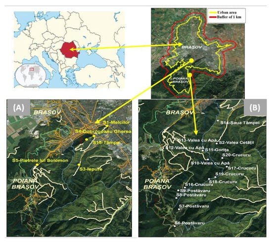 Spatial distribution of experimental plots from urban and peri-urban forests in Brasov metropolitan area ((A)—urban forest, (B)—peri-urban forest).