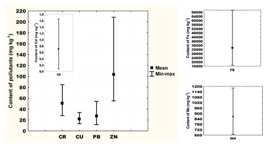 The contents of heavy metals were determined in the plots of the urban forest, as shown in Figure 2. The mean values of the Cd, Cu, and Pb were small compared with iron and manganese. The smaller values were observed for cadmium content at under 1 mg kg−1. The largest degrees of variation occurred in the cases of the zinc and iron contents.