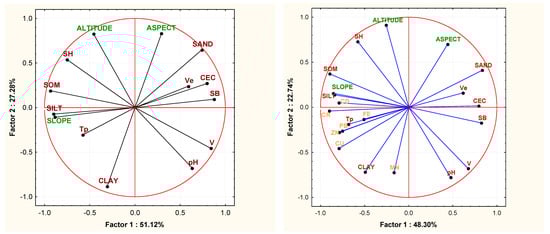 The next step of our analysis of the urban plots was to introduce the heavy metal contents as variables into the PCA. Seven components (factors) were extracted, but the first three accounted for 84% of the variance (Figure 3, right). For the first two factors with the highest eigenvalues (Figure 4, right), a graphical aspect of the variables was carried out. The results show a grouping of the heavy metal content variables (Figure 3, right) relating to the positions of the other variables. Factor 1 (48.30% of the variance) was explained by the CR, CEC, SB, CD, and SILT with a significant inverse correlation. In Factor 1, the CEC, SB, and Ve were negatively correlated with the CD, SILT, and CR. In the case of Factor 2 (22.74% of the variance), the MN and altitude explain these. In Factor 2 these two variables are inversely correlated.