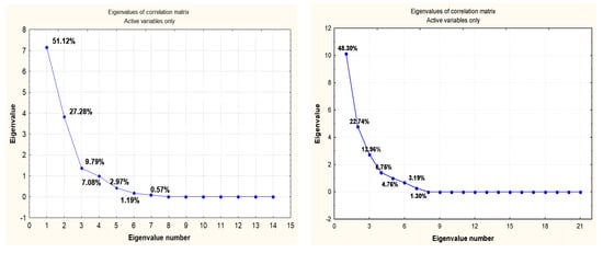 Eigenvalue of correlation matrix for soil properties and relief characteristics from urban forest (left) and eigenvalue of correlation matrix for soil properties with heavy metals content and relief characteristics (right).