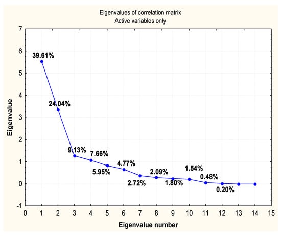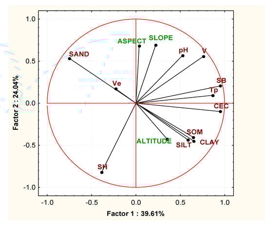 Regarding the peri-urban plots, 12 factors were extracted using the PCA. The first three factors represent 72.78% of the total variance in the 14 characteristics (Figure 5). Only two principal components were retained in the analysis because they had higher eigenvalues (Figure 6). The first component (Factor 1) contributed 39.61% of the total variance and the second one (Factor 2) contributed 24.04%. Compared with the urban plots, in the case of the peri-urban plots, the variables with the strongest influence on Factor 1 were the CEC loadings, Tp, and SB. The variables with the strongest influence on Factor 2 were the aspect and slope. Similar to the urban plots, Ve was the variable with the least significant influence on Factors 1 and 2. Another variable with a low influence on Factor 2 was altitude.