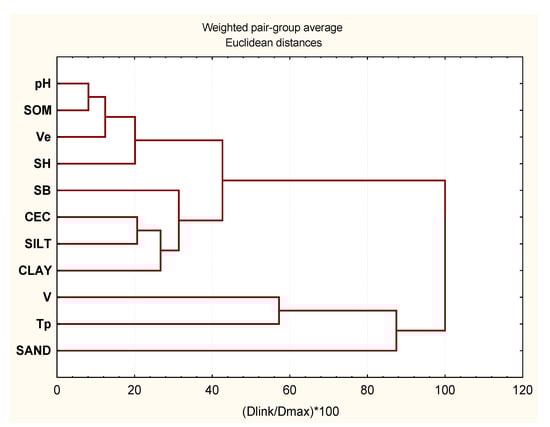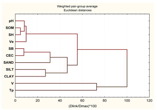 For the peri-urban plots, five clusters were formed. The sand with V and Tp had the highest Euclidian distance (Figure 8). The cluster with the lowest Euclidian distance was the pH, SOM, Ve, and SH. Other similar properties which are under the same cluster were the SB, CEC, silt, and clay (Figure 8).