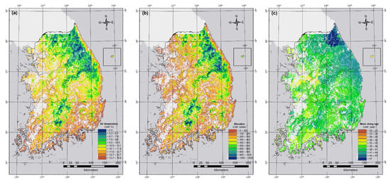 South Korean forest maps of (a) mean annual air temperature during 1991–2020, (b) elevation, and (c) mean stand age during the seventh national forest inventory survey period (2016–2020).