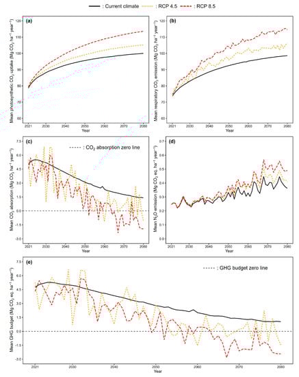 The GHG budget decreased over time because the CO2 absorption decreased, while the N2O emissions increased over time (Figure 2c,d,e). The decrease in the GHG budget due to N2O emissions was marginal in 2021 because N2O emissions were only 0.25 Mg CO2 eq. ha—1 year—1, while CO2 absorption was 5.0 Mg CO2 ha—1 year—1. However, the decreasing effects of N2O emissions on GHG budget increased over time because CO2 absorption continued to decrease. Meanwhile, under the RCP 4.5 and RCP 8.5, the decrease in the GHG budget over time was accelerated compared to those under current climate because CO2 absorption decreased while N2O emissions increased under climate change.