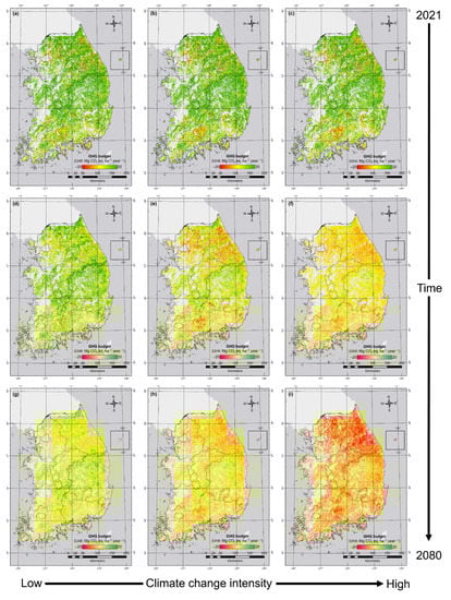 South Korean forest maps of GHG budget (a–c) in 2021, (d–f) in 2050, and (g–i) in 2080 under the current climate (left column), RCP 4.5 (center column), and RCP 8.5 (right column).