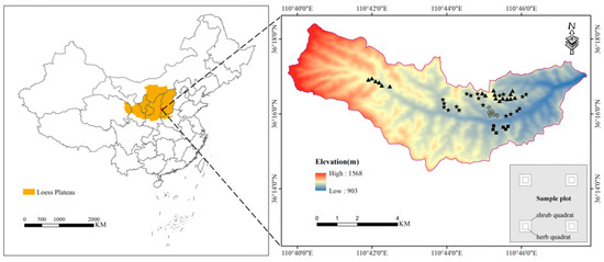 Location of the study area and sampling plots (★, R. pseudoacacia forest; ▲, P. tabuliformis forest; ⯀, shrubland; and ⊕, abandoned farmland). The figure in the lower right corner shows the settings of the shrub and herb quadrat in the sample plot.