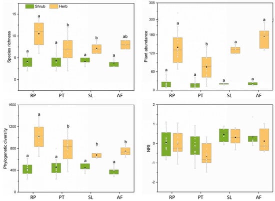 Species richness, plant abundance, phylogenetic diversity and NRI of different vegetation types. Different letters represent significant differences between different vegetation types (p < 0.05). The black dot in the box is the mean. The white dots in the boxplot are the values of each sample plot. RP, R. pseudoacacia forest; PT, P. tabuliformis forest; SL, shrubland; AF, abandoned farmland.