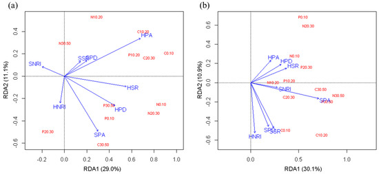 RDA ordination diagram for soil nutrients and vegetation factors in the R. pseudoacacia forest (a) and P. tabuliformis forest (b). SSR, shrub species richness; SPA, shrub plant abundance; SPD, shrub phylogenetic diversity; SNRI, shrub NRI; HSR, herb species richness; HPA, herb abundance; HPD, herb phylogenetic diversity; HNRI, herb NRI. C0.10 to C30.50 represent the SOC of each soil layer; N0.10 to N30.50 represent the TN of each soil layer; and P0.10 to P30.50 represent the TP of each soil layer.
