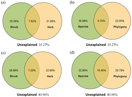 The variance component of soil nutrients explained by understory vegetation in the R. pseudoacacia forest (a,b) and P. tabuliformis forest (c,d). The overlap indicates a joint interpretation by the different groups.