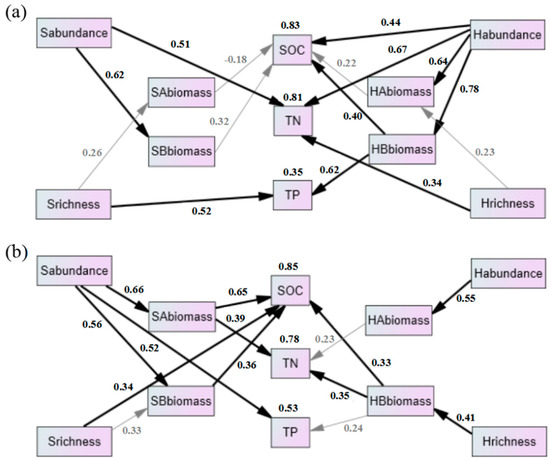 Direct and indirect effects of understory vegetation on SOC, TN and TP in R. pseudoacacia ((a) CMIN/DF = 1.106, GFI = 0.841, CFI = 0.981, RMSEA = 0.077) and P. tabuliformis forest ((b) CMIN/DF = 1.201, GFI = 0.819, CFI = 0.959, RMSEA = 0.109). Bold black arrows indicate significant correlations (p < 0.05). The number above the box represents the multiple R2. Sabundance, shrub abundance; Srichness, shrub richness; SAbiomass, shrub aboveground biomass; SBbiomass, shrub belowground biomass; Habundance, herb abundance; Hrichness, herb richness; HAbiomass, herb aboveground biomass; HBbiomass, herb belowground biomass.
