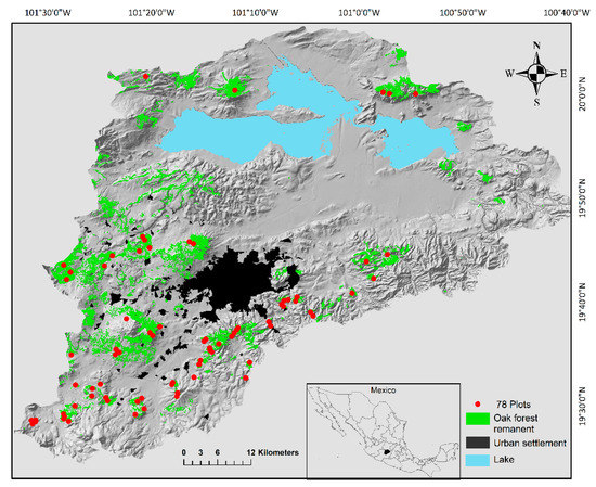 The Cuitzeo lake basin in Michoacán, Mexico. In the map, oak forest remnants are indicated in green and the locations of 78 plots (census units) in red dots. The location of each unit was defined by the presence of oak forests. In each plot we registered each tree of oak species in a 2000 m2 area [43]. The oak forests remanent were identified by analyzing the 2008 vegetation layer [66,67].