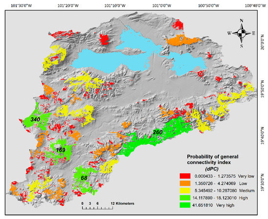 Probability of general connectivity index (dPC) between oak forest fragments in the Cuitzeo Lake Basin. Levels of importance for the general connectivity index are shown in the figure; this classification was based on the Jenks optimization model. In the map are shown the id of the four patches with the highest importance to general connectivity.