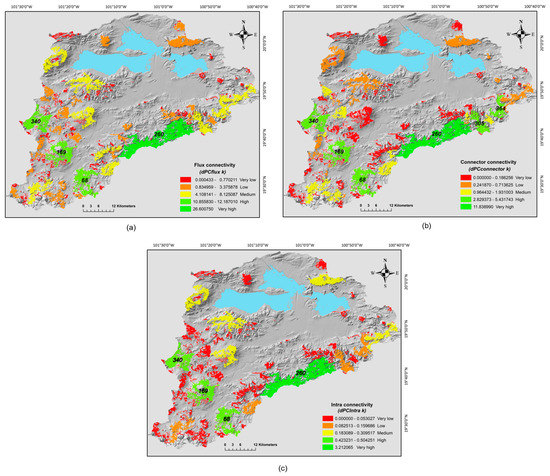 Different fractions of connectivity between oak forest fragments at the Cuitzeo basin; (a) flux connectivity (dPCfluxk), (b) connector connectivity (dPCconnectork) and (c) intrapatch connectivity (dPCintrak). Levels of importance for the three fractions of connectivity are shown in the figure, its classification was based on the Jenks optimization model. The id of the patches with the highest levels for the three fractions are exhibited in the maps.