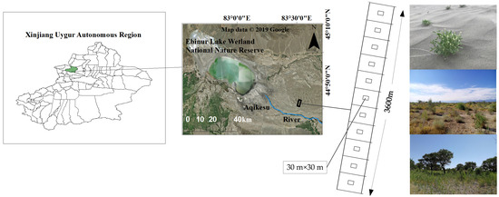 The study area was Ebinur Lake Wetland National Nature Reserve (44°30′−45°09′ N, 82°36′−83°50′ E). The Aqikesu River is located on the east side of the lake area and supplies water to Ebinur Lake. The soil water, salt, and nutrient contents decrease from the Aqikesu River bank to the Kumtag Desert. [36]. The basin belongs to the continental climate of the north temperate zone. The climate substantially varies between the four seasons. Rainfall is scarce in the summer, and the winter is cold and dry. The average annual temperature is 7.8 °C, and the maximum temperature and minimum temperature can reach 41.3 °C and −36.4 °C. The average annual precipitation is 90.9 mm. Therefore, the surrounding area is vulnerable to wind and sand, and the ecological environment is very fragile [37,38]. The typical zonal soils in the region are ash desert soil, ash palm desert soil, and aeolian sand soil, while the hidden zone soils are salt (salinization) soil, meadow soil, and marsh soil [37]. The wide variety of habitat types in the study area has given rise to a wealth of desert plant community types. There are rich salt-tolerant and drought-tolerant plants, as well as sandy, mesophyte, hygrophyte, and aquatic plants. There are more woody plants and herbaceous plants. The main plant species are Populus euphratica, Haloxylon ammodendron, Tamarix chinensis, Halostachys caspica, Kalidium foliatum, Reaumuria songonica, and Alhagi sparsifolia [38].