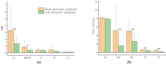 Soil physicochemical factors and community-weighted traits in different water gradients. (a) Community-weighted mean traits under different water gradients. (b) Soil factors under different water gradients. * Significant differences between high and low moisture gradient (p < 0.05); ** extremely significant differences between high and low moisture gradient (p < 0.01). Note: LL—leaf length, DBH/BD—diameter at breast height/base diameter, H—plant height, LW—leaf width, LT—leaf thickness.