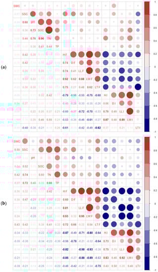 Correlation between interspecific and intraspecific variation and soil factors under different water gradients. (a) High moisture gradient; (b) low moisture gradient. SWC—soil water content, SSC—soil salt content, pH—pH value, SOC—soil organic carbon, TN—total nitrogen, TP—total phosphorus, H—plant height, D—diameter at breast height/base diameter, LL—leaf length, LW—leaf width, LT—leaf thickness. F denotes interspecific variation, and I denotes intraspecific variation.