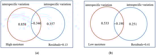 Contribution of intraspecific variation to community weighting under different soil moisture gradients. (a) High moisture gradient; (b) low moisture gradient.
