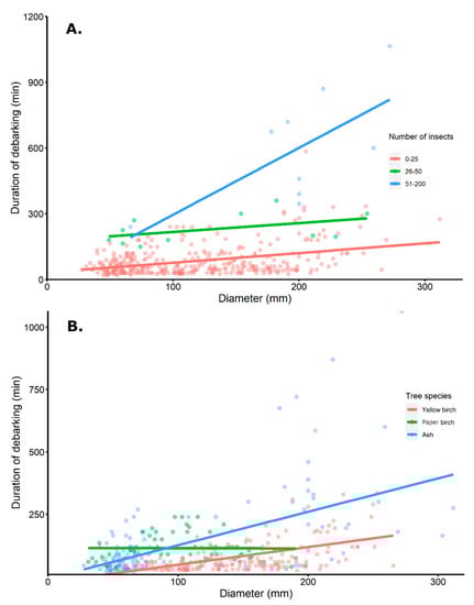 While the duration for scanning the samples is simply dependent on their length (about an hour for ten 1 m samples), all interactions significantly affected the duration of debarking (Table 3, Figure 2); larger logs and ash samples took longer to debark, and this increase was higher when more insects were present.