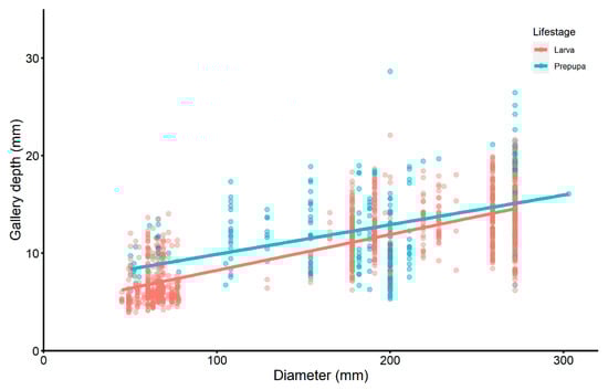 For A. planipennis, lifestage, diameter, and their interaction significantly affected the gallery depth (Table 4 and Table 5); the galleries were deeper for prepupae, and it increased with an increase in the diameter of the sample, but this increase was faster for larvae (Figure 3). A total of 27.4% of the insects were found in the bark: 26.9% of the larvae and 29.3% of the prepupae. For insects found in the wood, the maximal depth was 21.9 mm in the sapwood, excluding bark. Raw data on gallery depths in the sapwood, i.e., excluding bark, can be found in Figure S1A.