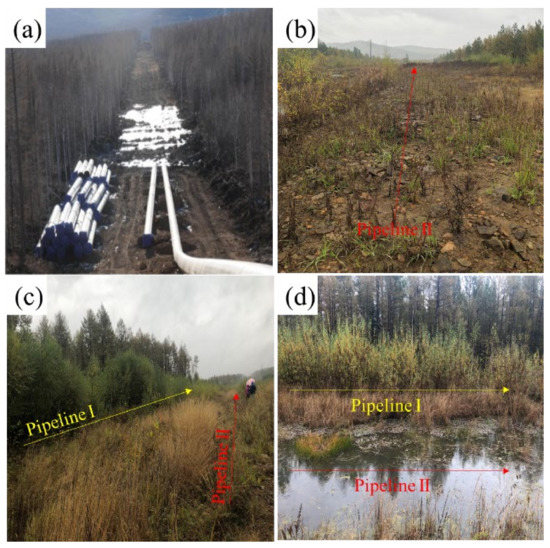 Pipeline corridors, as one representative type of linear engineering infrastructures and environmental disturbances, are widespread owing to the growing demand for natural resources [1,2]. Pipeline corridors are created for oil and gas exploration and transportation in hydrocarbon-rich boreal and tundra ecosystems in North America [3] and northern Eurasia [4], and in other alpine and high-plateau permafrost regions at mid- to low latitudes, e.g., [5,6,7]. There are more than 2485 km of pipelines in Alaska, 2031 km in China [8], and hundreds of potential routes and tens of thousands of kilometers for pipelines in northern Canada and Russia [9].