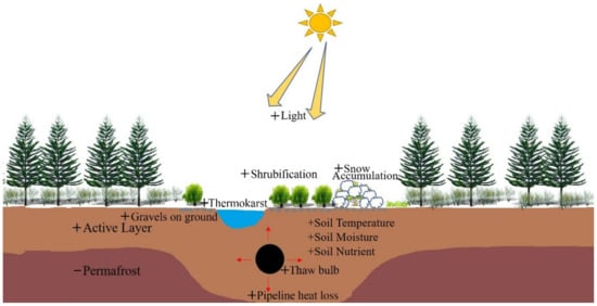 Pipeline construction and operation, as well as maintenance (e.g., by adding more readily available gravelly soils above or near pipelines to mitigate water and wind erosion and filling up the thermokarst lakes and depressions with soils) and emergency responses, may generally result in permafrost degradation, as evidenced by a warmer soil/ground, lowering the permafrost table and/or thickening the active layer, ground surface subsidence and thermokarsting, and formation of the supra-permafrost subaerial talik; consequently, they modify or alter the physical, biophysical, chemical and biological properties of foundation soils [1,16].