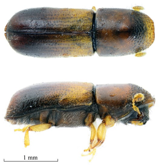 - Wood, S.L.; Bright, D.E. A Catalog of Scolytidae and Platypodidae (Coleoptera), Part 2. Taxonomic Index (Volumes A, B); Brigham Young University: Provo, UT, USA, 1992; pp. 1–1553. [Google Scholar]