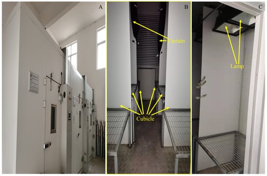 The large artificial climate chamber photos showing (A) the three artificial climate chambers, (B) six cubicles of each chamber separated by wooden boards and opaque curtains, and (C) a view of the cubicle and the lamps in it.