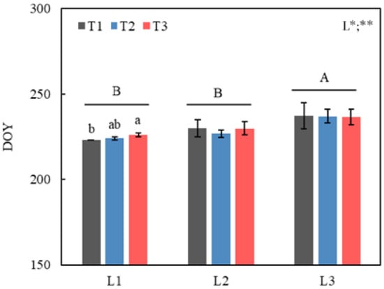 Changes in leaf coloration onset (LCO) of Quercus mongolicus seedlings under the temperature and photoperiod treatments. Error bars represent means ± SE (n = 4). DOY represents day of year; T1 represents control; T2 represents 1.5 °C warming; T3 represents 2.0 °C warming; L1 represents 18 h photoperiod (long photoperiod), L2 represents 14 h photoperiod (control), and L3 represents 10 h photoperiod (short photoperiod). The different uppercase letters show significant differences among photoperiod treatments (p < 0.05), and the lowercase letters show significant differences among temperature treatments (p < 0.05). * and ** were used to indicate significant differences in temperature (T) and photoperiod (L) and their interaction effect at p < 0.05 and p < 0.01, respectively.